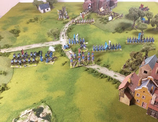 Both sides also advanced their light troops to seize the Tierwald, The Karavani Croats for the Astrovians, and the Muller Light Dragoons for the Vaubarians. The latter advanced stealthily but steadily as the mist shrouded the open ground between the villages, and entered the woods. The Croats ascended the hill, and then descended into the woods on their side. The ensuing firefight was bloody, and after a couple of turns, the dragoons got the better of it. The Croats evacuated the woods and headed back to the village of Kovyd, no doubt to cause some trouble in the taverns (even though all such hostelries had been ordered to close).